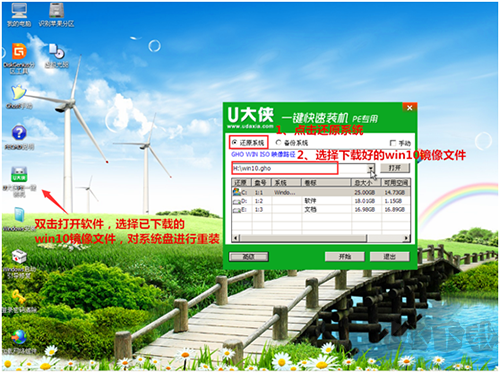 進入桌面后,打開“U大俠PE一鍵裝機”工具,選擇“還原系統(tǒng)”選項,然后在GHO WIN ISO映像路徑中選擇之前下載好的Win10鏡像文件(win10.gho),如下圖: