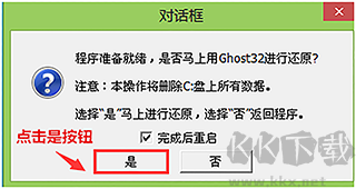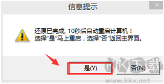 點擊“開始”后,會彈出提示框,詢問是否確認進行系統(tǒng)還原,完成后是否自動重啟。請選擇“完成后重啟”并點擊“是”按鈕。