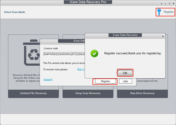 8. 打開 iCare Data Recovery Pro 軟件,點擊“Register”按鈕,將注冊機中的注冊碼復(fù)制到軟件對應(yīng)字段,點擊“Register”完成注冊。