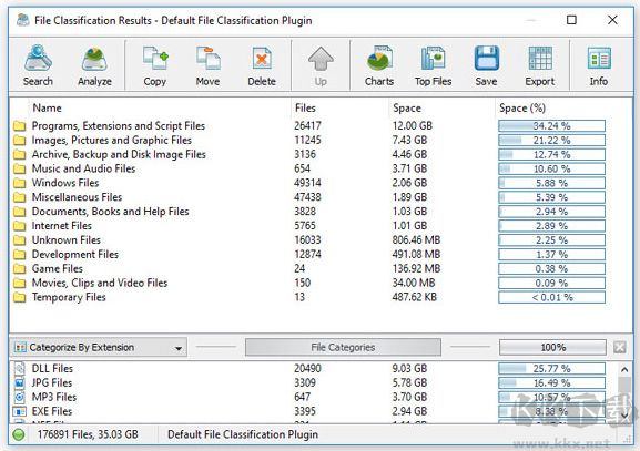 DiskBoss能夠掃描磁盤、網絡共享和NAS設備,使用多種文件分類插件對文件進行智能分類。它支持自動識別超過3500種文件類型,并允許用戶瀏覽分類后的文件結構、生成餅圖、保存分類報告,甚至按照用戶設定的規(guī)則重組和管理文件。