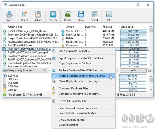 DiskBoss內置了強大的重復文件查找工具,能夠幫助用戶掃描磁盤、服務器、NAS設備中的重復文件。它支持生成文件餅圖、保存報告、刪除重復文件,甚至將重復文件鏈接或壓縮后移動至其他位置。