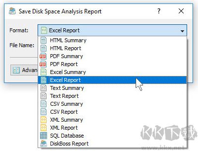DiskBoss還提供了一個有用的功能——將磁盤空間分析、文件分類、文件搜索結果等導出為Microsoft Excel格式的報告。用戶可以選擇導出簡短摘要或詳細報告,并支持各種圖表格式。