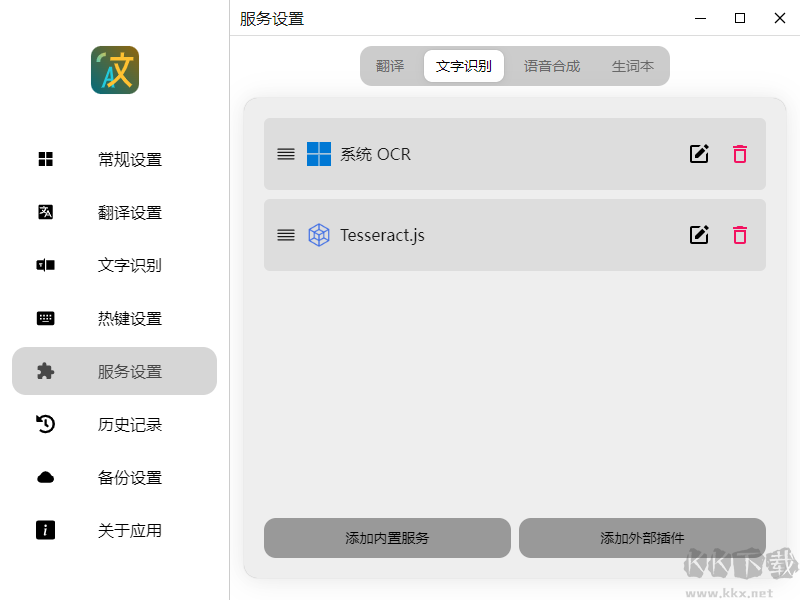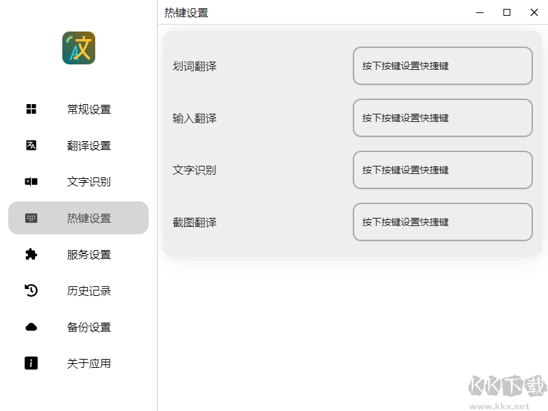 以下是幾個(gè)需要特別設(shè)置的功能:“翻譯設(shè)置”、“文字識(shí)別”、“熱鍵設(shè)置”和“服務(wù)設(shè)置”。