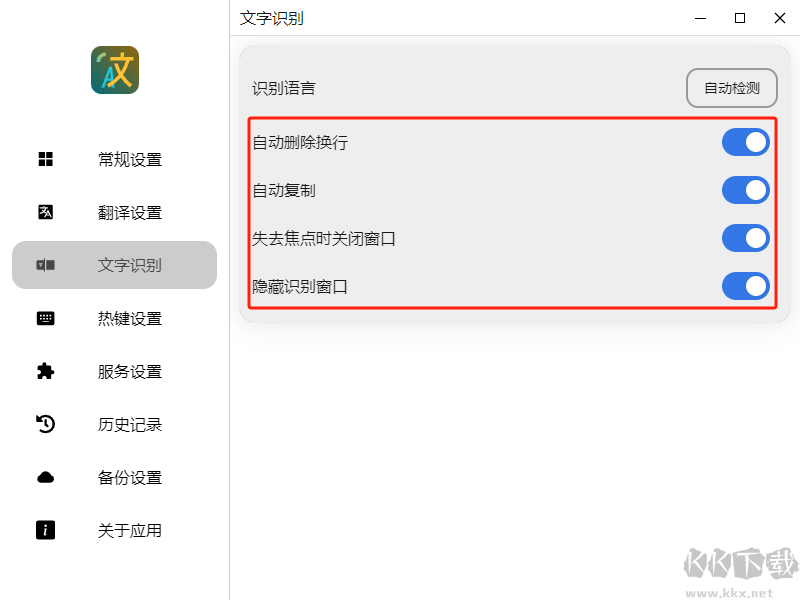 在此功能中,你可以啟用自動(dòng)刪除空行、自動(dòng)復(fù)制、自動(dòng)隱藏窗口等選項(xiàng)。啟用“自動(dòng)復(fù)制”和“隱藏識(shí)別窗口”功能后,進(jìn)行截圖翻譯時(shí)不會(huì)彈出識(shí)別窗口,翻譯結(jié)果會(huì)自動(dòng)復(fù)制到剪切板。