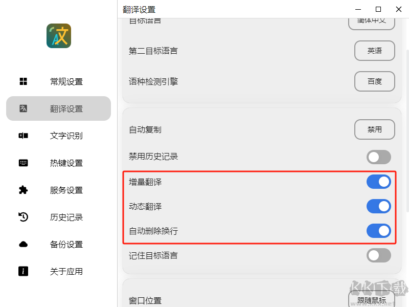 你可以開啟自動(dòng)復(fù)制、增量翻譯、動(dòng)態(tài)翻譯、自動(dòng)刪除換行、記住目標(biāo)語言、隱藏原文和隱藏翻譯窗口等功能。