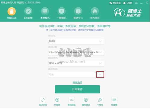 第二步:進(jìn)入“韓博士裝機(jī)大師(U盤版)”界面,點(diǎn)擊“添加系統(tǒng)”中的“+”,選擇需要安裝的操作系統(tǒng);