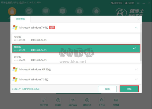 第三步:韓博士裝機(jī)大師提供了多個(gè)Windows操作系統(tǒng)文件供選擇,用戶可以根據(jù)自己的需求選擇合適的系統(tǒng)。接著點(diǎn)擊右下角的“選擇”按鈕,繼續(xù)操作。以Win7 64位旗艦版為例。