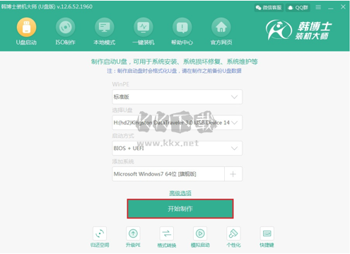 啟動(dòng)韓博士裝機(jī)大師,選擇“U盤啟動(dòng)”功能。進(jìn)入U(xiǎn)盤模式后,選擇需要安裝的操作系統(tǒng),點(diǎn)擊“開始制作”。