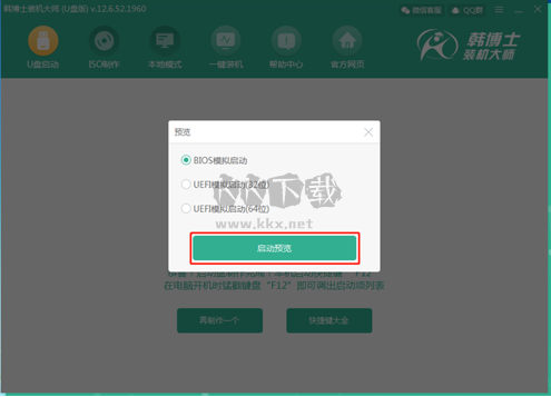 選擇“啟動(dòng)預(yù)覽”,韓博士裝機(jī)大師將模擬啟動(dòng),若出現(xiàn)韓博士U盤系統(tǒng)維護(hù)工具界面,說明制作成功。
