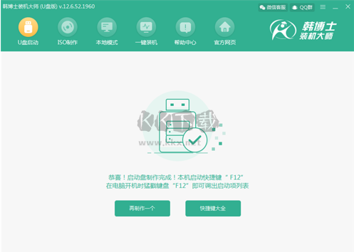 第八步:制作完成后,軟件會(huì)顯示啟動(dòng)快捷鍵信息。使用此快捷鍵進(jìn)入BIOS設(shè)置,將U盤設(shè)為第一啟動(dòng)項(xiàng),然后進(jìn)入韓博士PE系統(tǒng)。