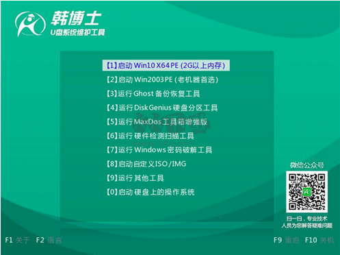 2. 選擇USB選項(xiàng)后,會(huì)彈出韓博士PE菜單界面,選擇“【01】啟動(dòng)Win10X64PE(2G以上內(nèi)存)”,回車確認(rèn)。