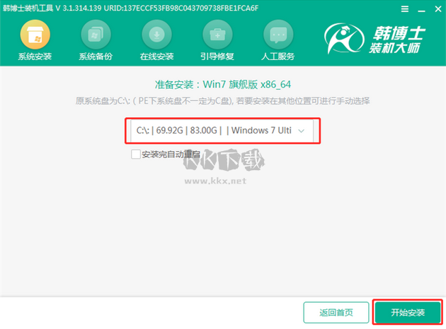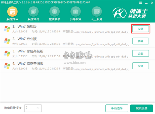 3. 進(jìn)入PE系統(tǒng)后,韓博士裝機(jī)工具會(huì)自動(dòng)彈出,選擇U盤中的“win7旗艦版”系統(tǒng)文件,點(diǎn)擊“安裝”;
