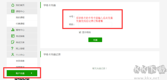 安裝并登錄題庫系統(tǒng)后,點擊“賬戶充值”,輸入卡號和卡密后,點擊“確認”進行充值。