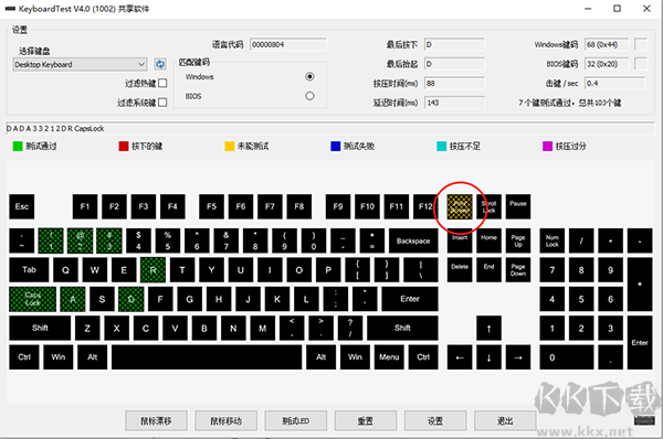 1、在測試過程中,當(dāng)你按下鍵盤的任意一個按鍵時,軟件界面上相應(yīng)的按鍵位置會顯示“綠色斜紋”,表示該按鍵工作正常。如果按鍵未能顯示綠色斜紋,則表明該按鍵存在問題,如下圖所示:
