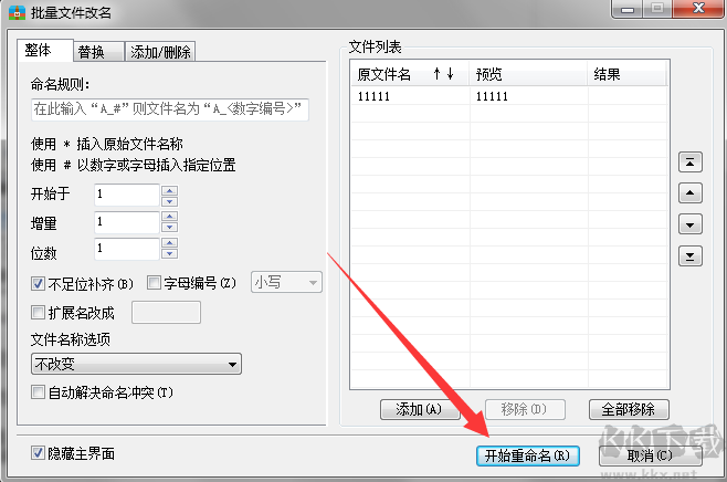 3、選定文件后,直接點(diǎn)擊“開始重命名”按鈕進(jìn)行批量改名。