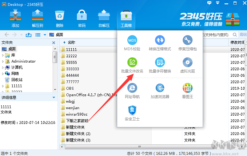 2、在軟件主界面中,選擇你想重命名的文件,點(diǎn)擊【工具箱】,然后選擇【批量文件改名】;