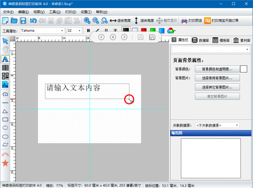 點擊左側(cè)的文本按鈕,鼠標(biāo)變?yōu)椤?txt”時,在標(biāo)簽內(nèi)容編輯區(qū)域拖動鼠標(biāo)即可創(chuàng)建文本區(qū)域。