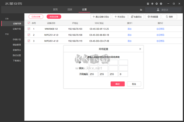 在【設(shè)置>設(shè)備列表>待添加設(shè)備】中,刷新后可以看到未添加的攝像頭。選擇需要修改IP地址的攝像頭,點(diǎn)擊【網(wǎng)絡(luò)配置】,然后輸入新的起始IP地址和網(wǎng)關(guān)。點(diǎn)擊【確定】即可完成修改。