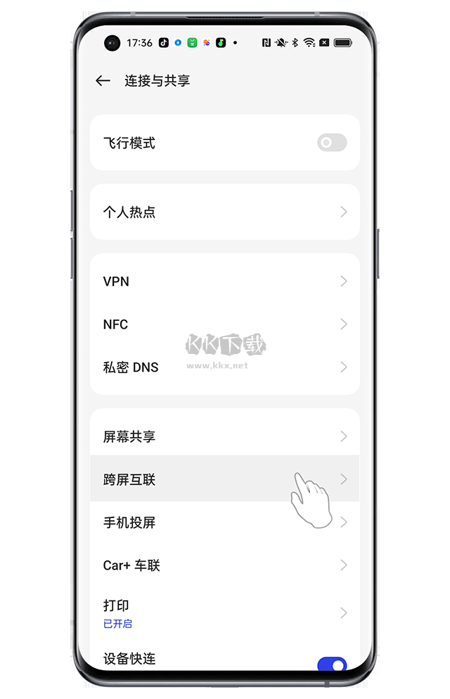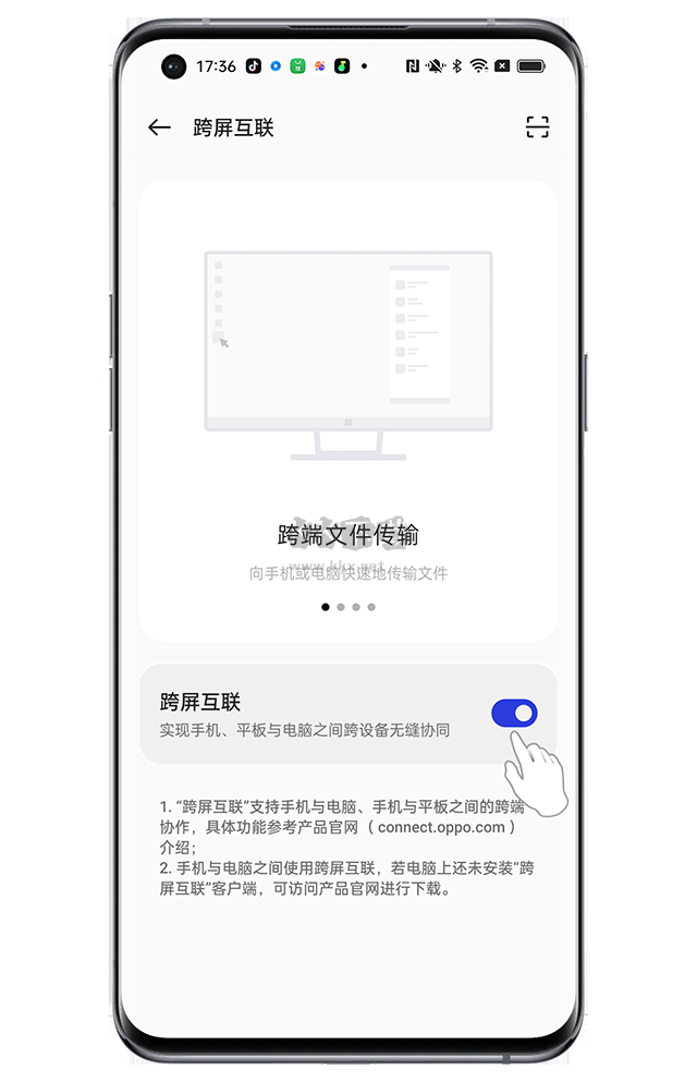 1、首先在手機端開啟“跨屏互聯(lián)”功能(前往「設(shè)置 > 連接與共享 > 跨屏互聯(lián)」或在狀態(tài)欄下拉,找到跨屏互聯(lián)開關(guān))。然后在電腦端啟動客戶端(若電腦與OPPO手機連接,請訪問https://connect.oppo.com下載,若為realme手機,訪問https://pc.heytap.com下載)。手機接近電腦時,會自動彈出連接框,點擊“連接”即可完成連接。