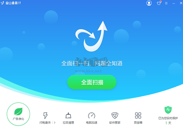 1、打開金山毒霸主界面,點(diǎn)擊“全面掃描”進(jìn)行系統(tǒng)掃描。