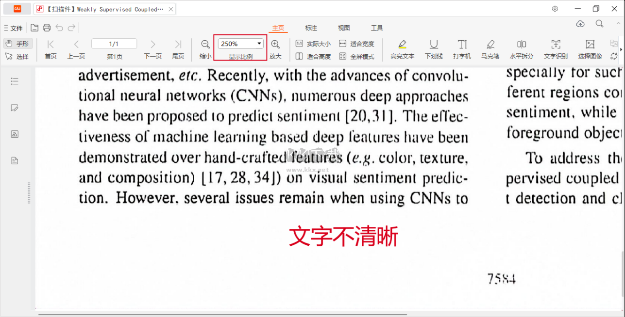 通過(guò)放大頁(yè)面,若文字不清晰或出現(xiàn)鋸齒狀邊緣,則很可能是掃描件,如下圖所示: