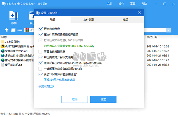 在360壓縮菜單中,點擊【工具】,選擇【選項】,在彈出的【設(shè)置】界面中,勾選【層疊右鍵關(guān)聯(lián)菜單】選項,點擊【確定】確認(rèn),即可減少右鍵菜單中的選項為一項。