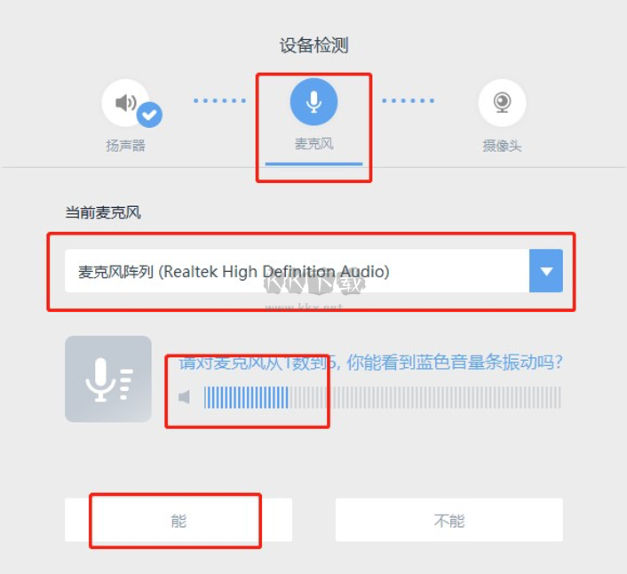 步驟二:在麥克風(fēng)檢測(cè)界面,點(diǎn)擊“當(dāng)前麥克風(fēng)”的下拉按鈕,嘗試不同的麥克風(fēng)選項(xiàng)。對(duì)著麥克風(fēng)說(shuō)話,觀察音量條波動(dòng),選擇有波動(dòng)的麥克風(fēng)進(jìn)行上課。
