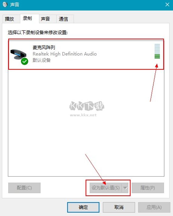 在彈出的錄音設(shè)備窗口中,選擇正在使用的麥克風(fēng)。如果有多個(gè)設(shè)備,嘗試對(duì)著麥克風(fēng)講話,找到音量條有波動(dòng)的麥克風(fēng),設(shè)置為默認(rèn)設(shè)備。