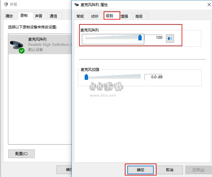 雙擊正在使用的麥克風(fēng)設(shè)備,進(jìn)入“級(jí)別”選項(xiàng)卡,將“麥克風(fēng)陣列”的音量調(diào)至最大,“麥克風(fēng)增強(qiáng)”調(diào)至最小。