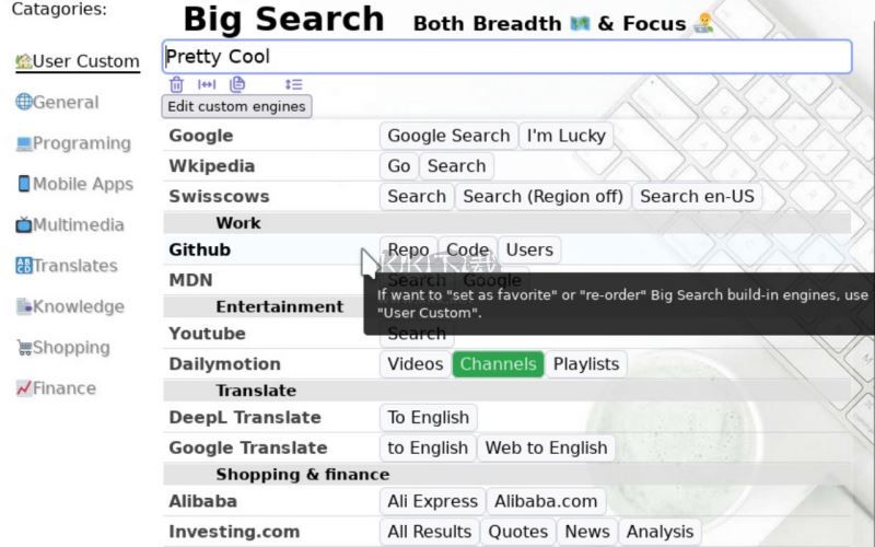 采用JSON格式作為引擎數(shù)據(jù)庫,支持內置和自定義引擎,且提供GUI界面進行易于操作的編輯。引擎數(shù)據(jù)和搜索方式具備高度的靈活性和擴展性。