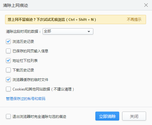2. 在彈出的清除上網(wǎng)痕跡窗口中,選擇要清除的項目,您也可以直接使用快捷鍵Ctrl+Shift+N來加速此操作