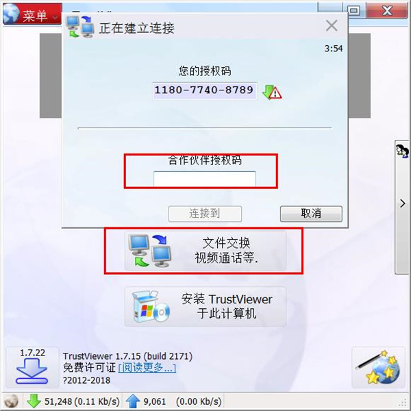 3、在另一臺計(jì)算機(jī)上也運(yùn)行TrustViewer,點(diǎn)擊“連接到遠(yuǎn)程計(jì)算機(jī)”選項(xiàng),并輸入之前顯示的12位ID,便可進(jìn)行連接。