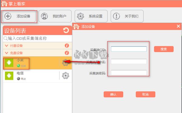 3、添加設(shè)備(這是采集端設(shè)備,通常使用手機或平板安裝采集端,打開即可),找到ID并添加;
