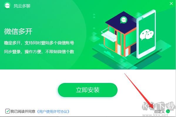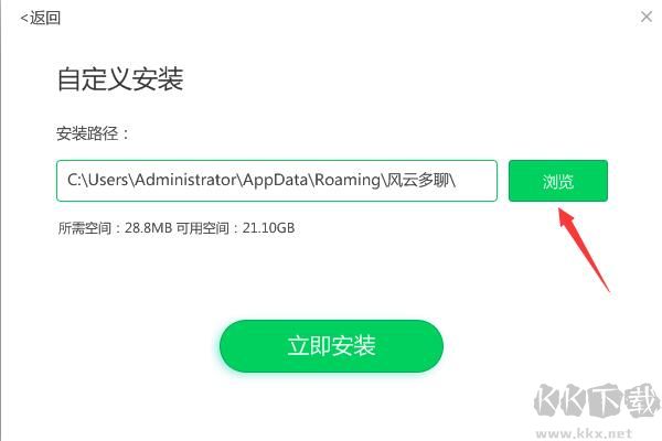 1. 訪問本站,下載風(fēng)云多聊官方版安裝包。解壓后,雙擊exe文件進(jìn)入安裝界面,選擇自定義安裝。
